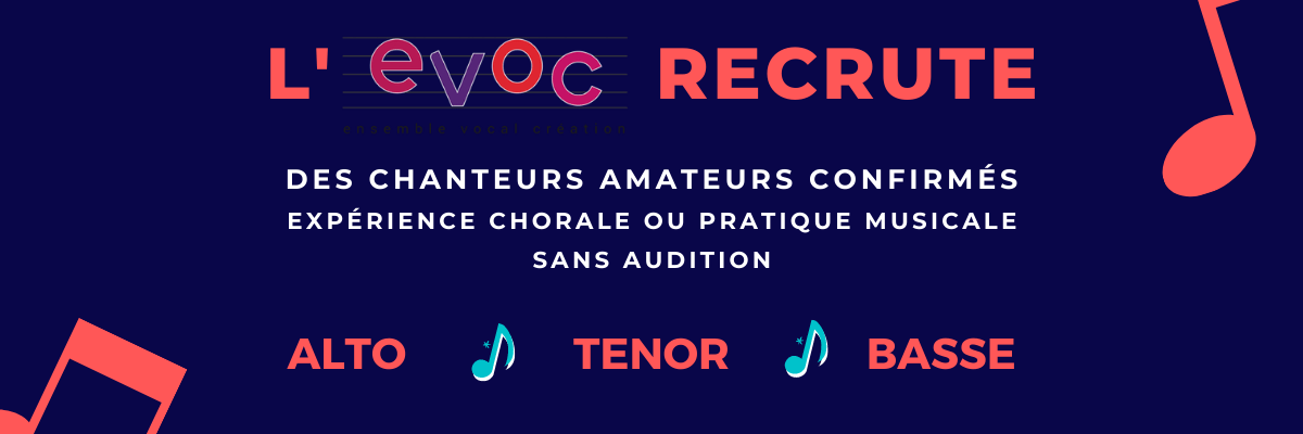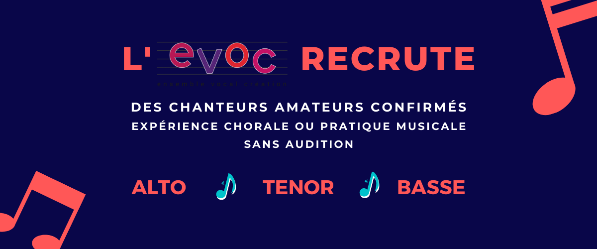 L’EVOC recrute des chanteurs amateurs confirmés (expérience chorale ou pratique musicale), sans audition. Nous recherchons principalement des alti, ténors et basses.